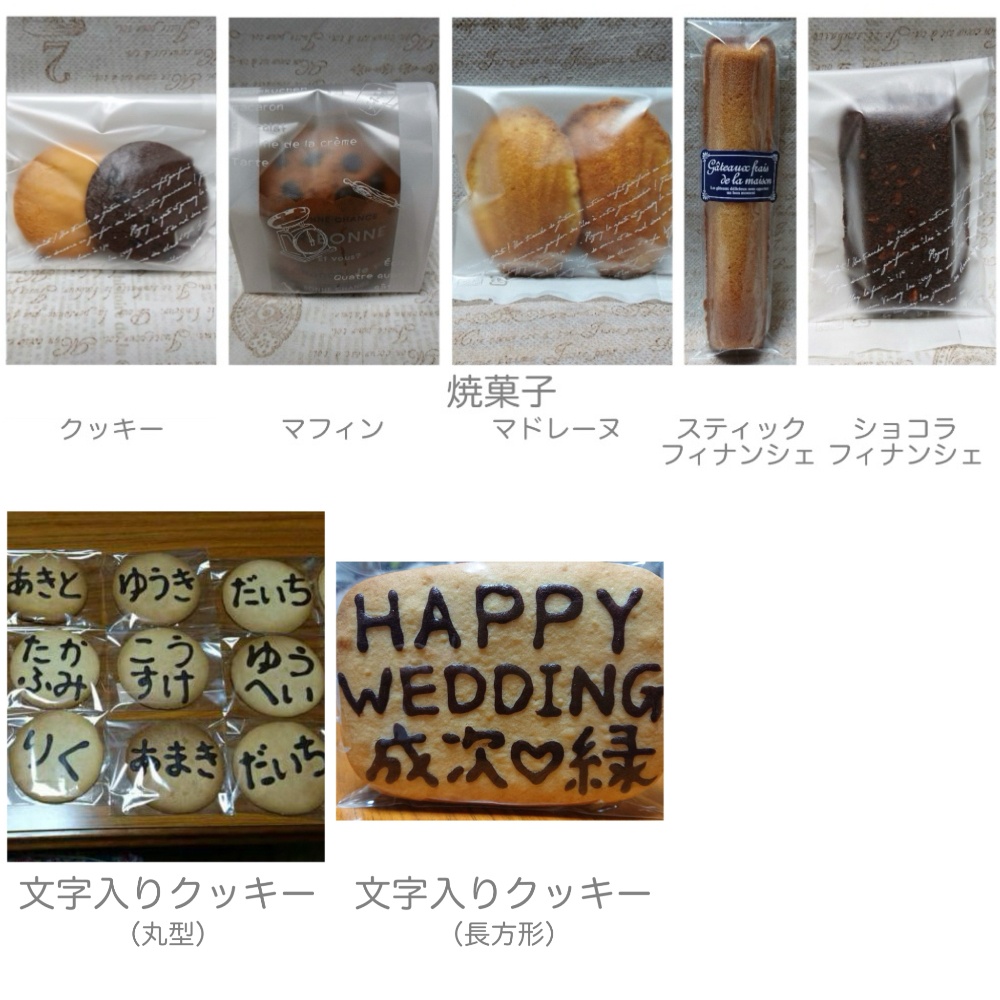 | お土産やプレゼントにピッタリの焼菓子♡ ・クッキー(2枚) ¥120 ※プレーン、チョコチップからお選びください。 ・マフィン(1個) ¥180 ・マドレーヌ(2個) ¥100 ・スティックフィナンシェ(1本) ¥180 ・ショコラフィナンシェ(1個) ¥150 (全商品袋入り) ※ 箱入りの詰め合わせも可能です! 枚数によって価格が異なりますのでご相談ください。 |